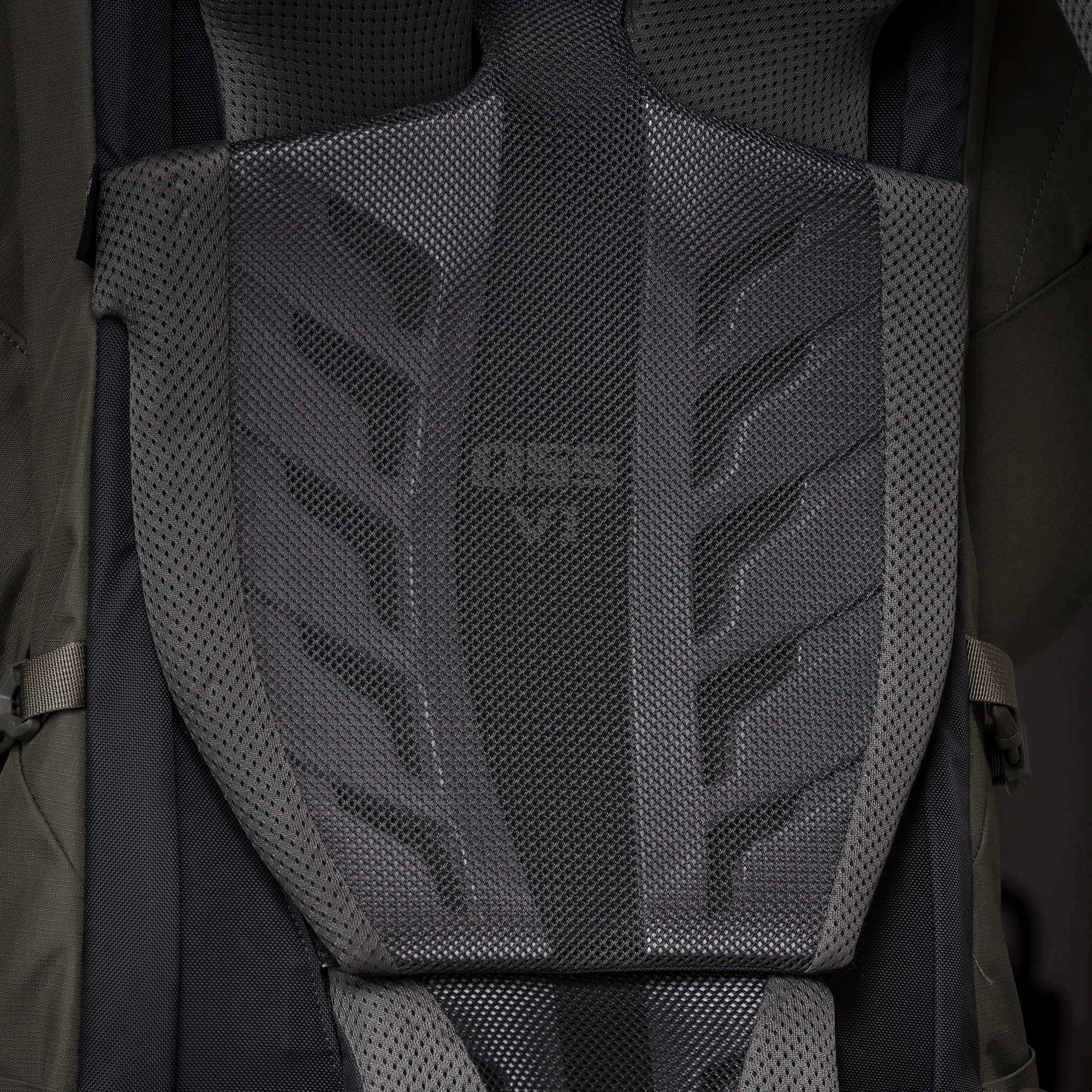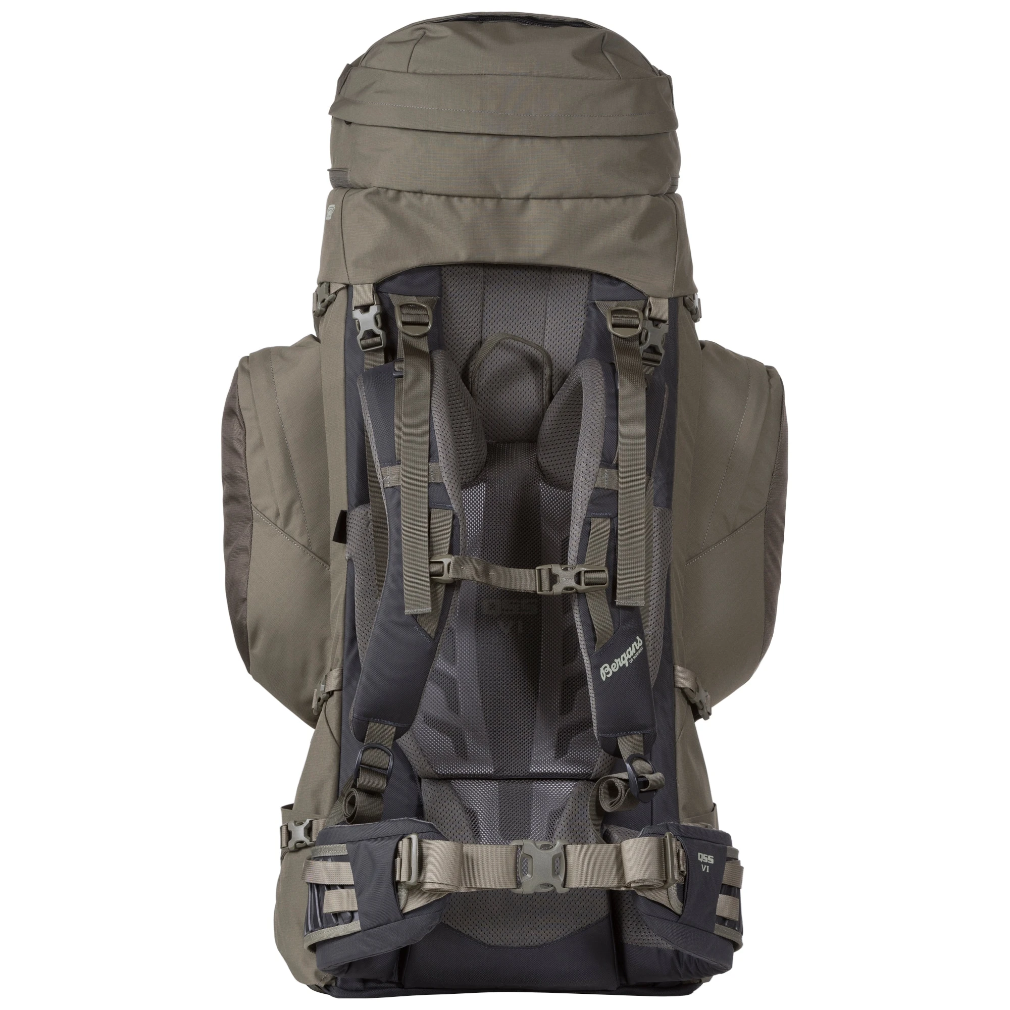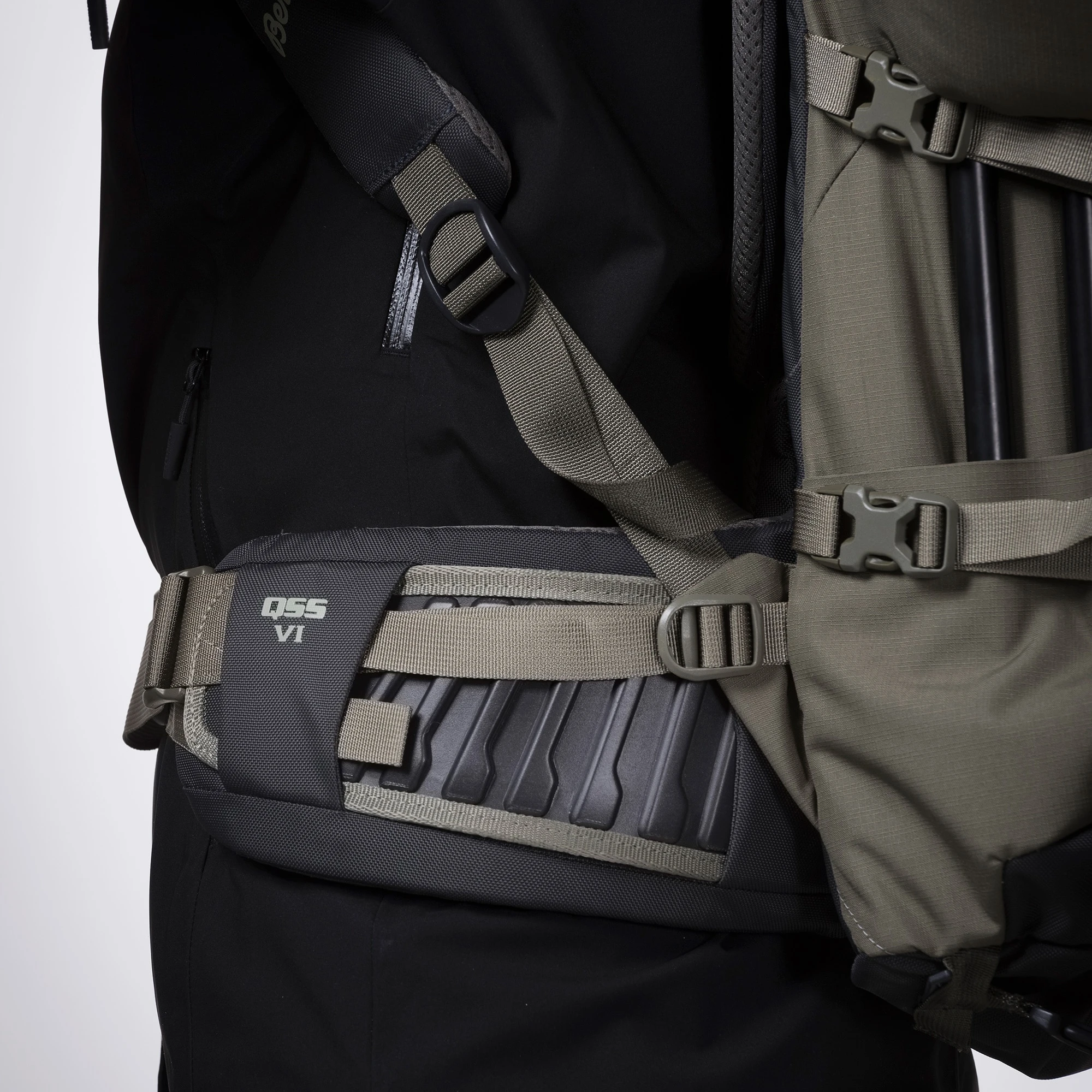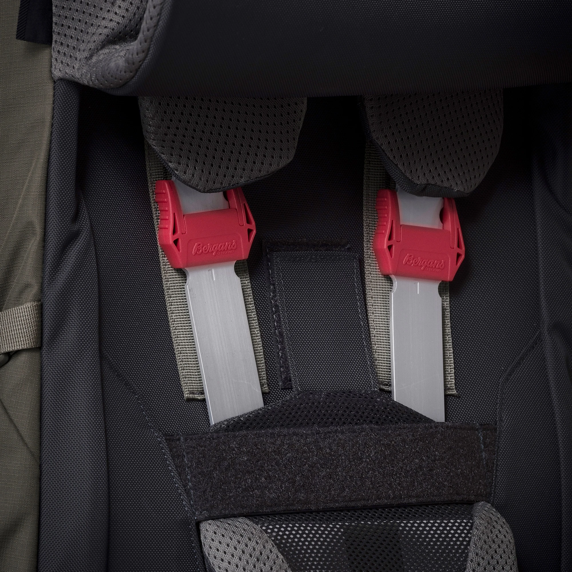 Sjette generasjon QSS VI gjør ryggsekken lettere og mer komfortabel enn noen gang. Vekten overføres med støtabsorberere som reduserer belastningen. Individuell høydejustering av venstre og høyre skulderrem. Ventilerende Bergans FlowPanel™ i ryggflaten. Justerbare strammeremmer øverst.