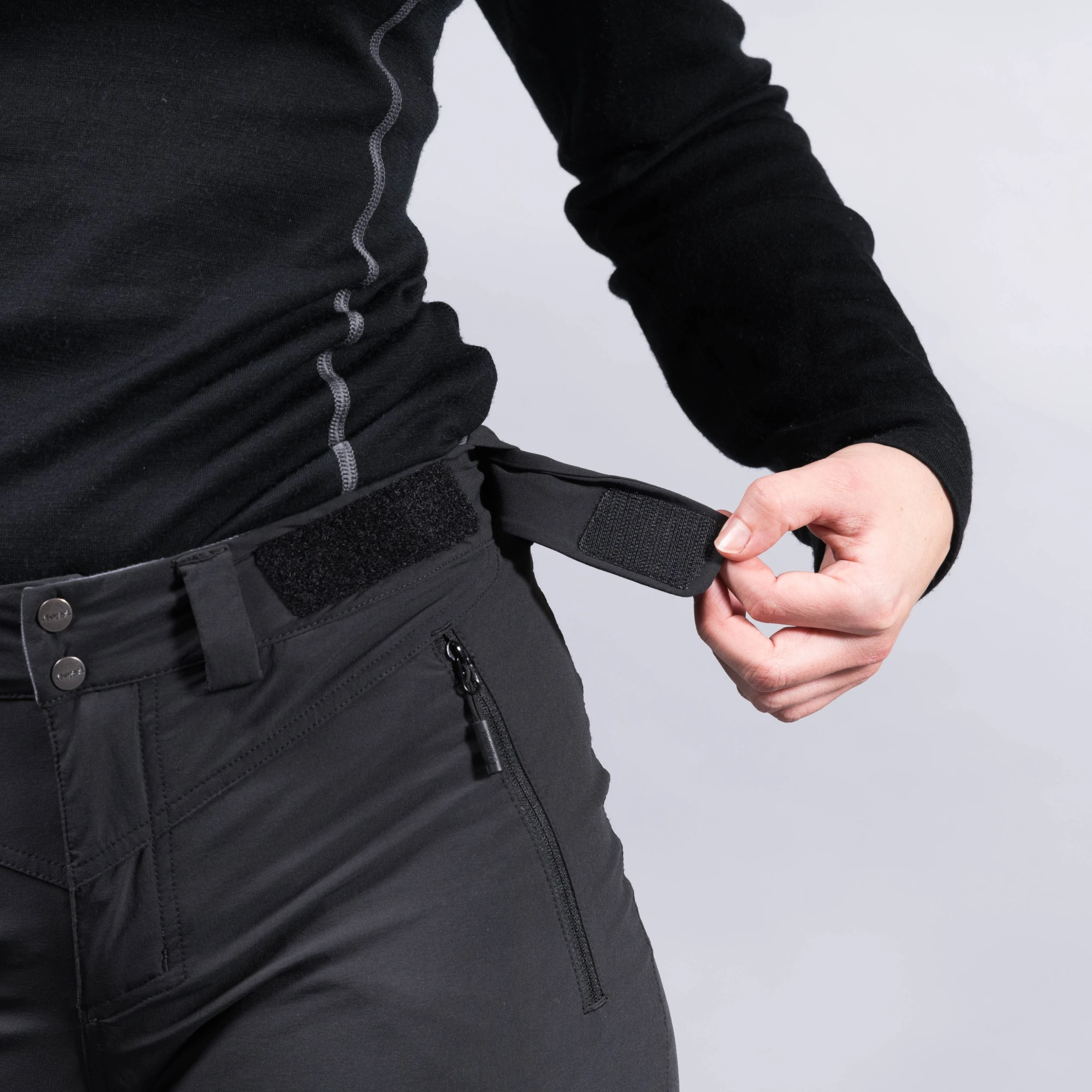 Beltehemper. Formsydd kneparti. Glidelåsåpning med kile for justering av benvidde. Borrelåsjustering i nederkant. Forsterkning nederst på bena. Innersømmen er forskjøvet for mindre friksjon og økt komfort. Mykt materiale på innsiden av livet for økt komfort.
