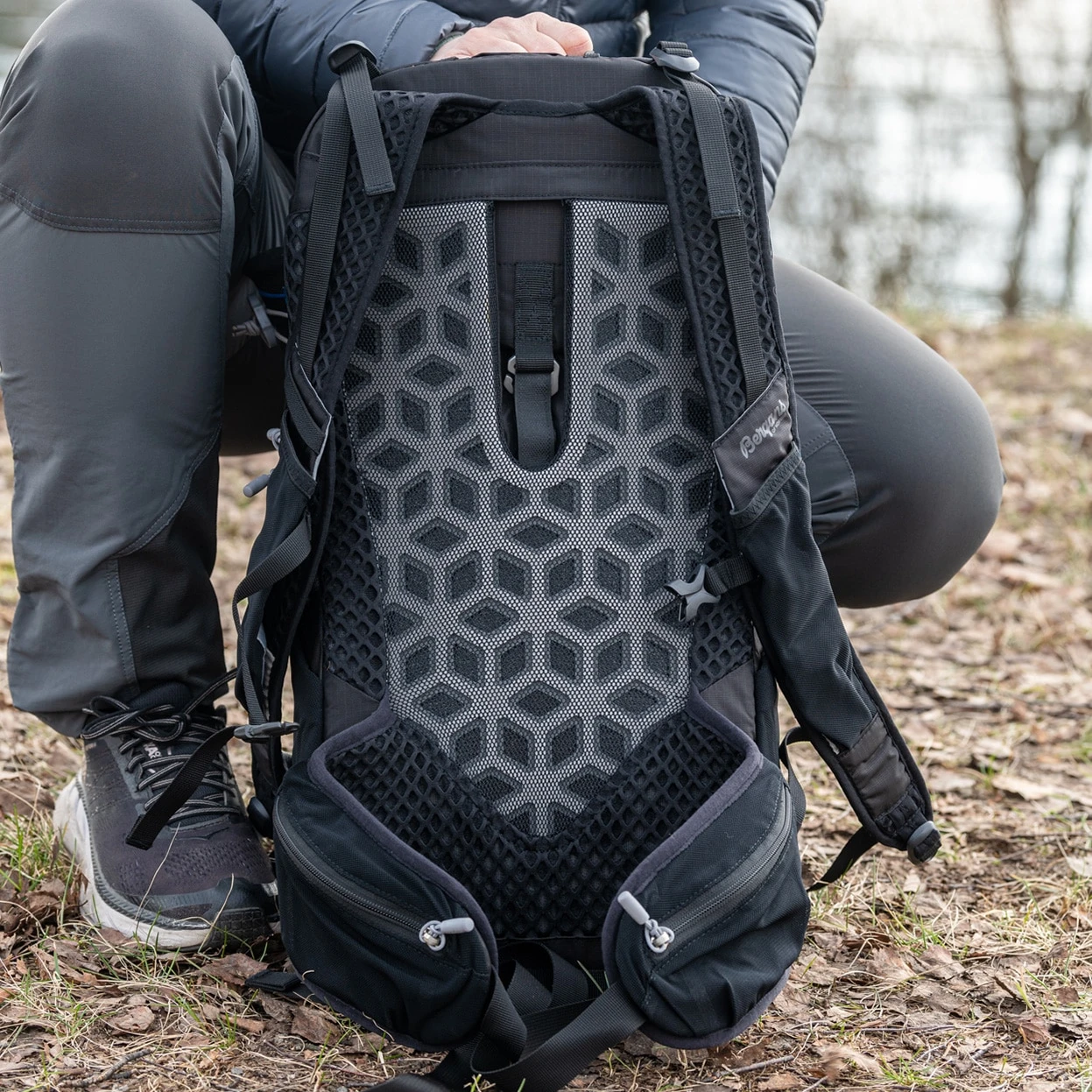 Dynamisk rem med Bergans Articulated harness, som automatisk tilpasser seg brukerens skuldre. Bergans QuickAdjust™ PRO, justerbar rygglengde. Ventilerende Bergans FlowPanel i ryggflaten. Ventilerende skulderrem med toppstrammere. Ventilert og vattert hoftebelte med lommer.