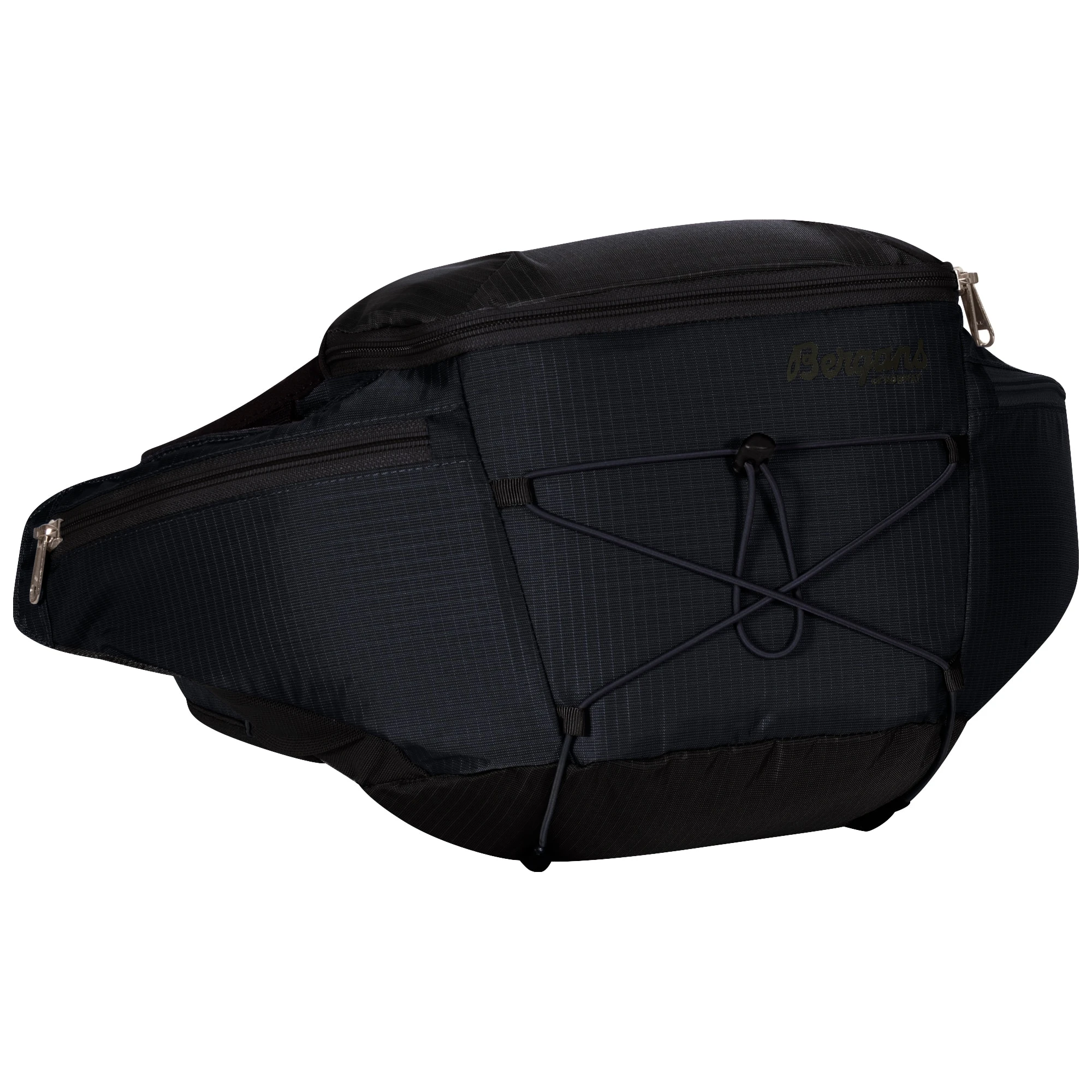 Doble flaskeholdere med kompresjon (flaske følger ikke med), hoftelommer med glidelås på begge sider, stort hovedrom med glidelåslomme på innsiden.