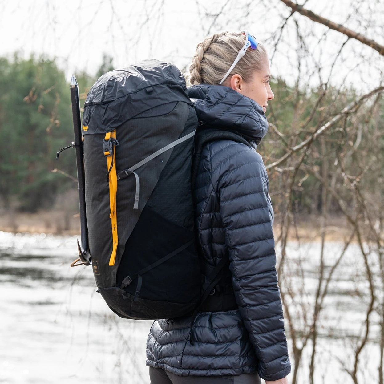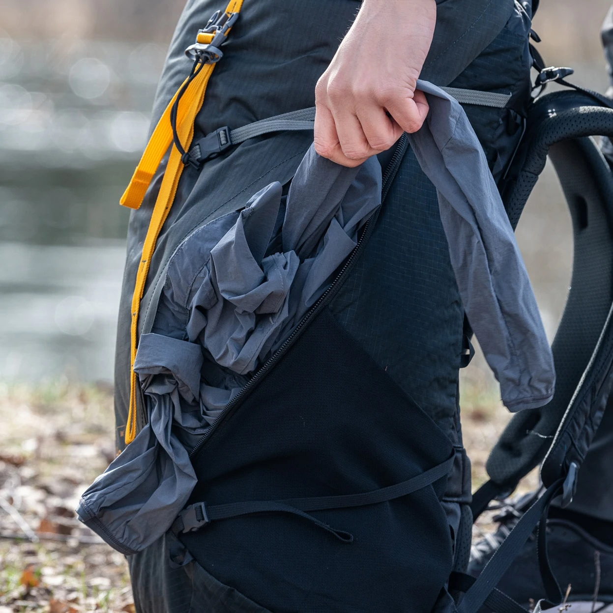 Den klassiske toppåpningen med snølås kombinert med diagonal glidelås foran gir enkel tilgang til innholdet. Doble kompresjonsremmer på hver side. Slitesterkt, komfortabelt og kraftig Nylon 66-materiale i kombinasjon med et ripstopmateriale av den robuste, lette og allsidige Dyneema®-fiberen.