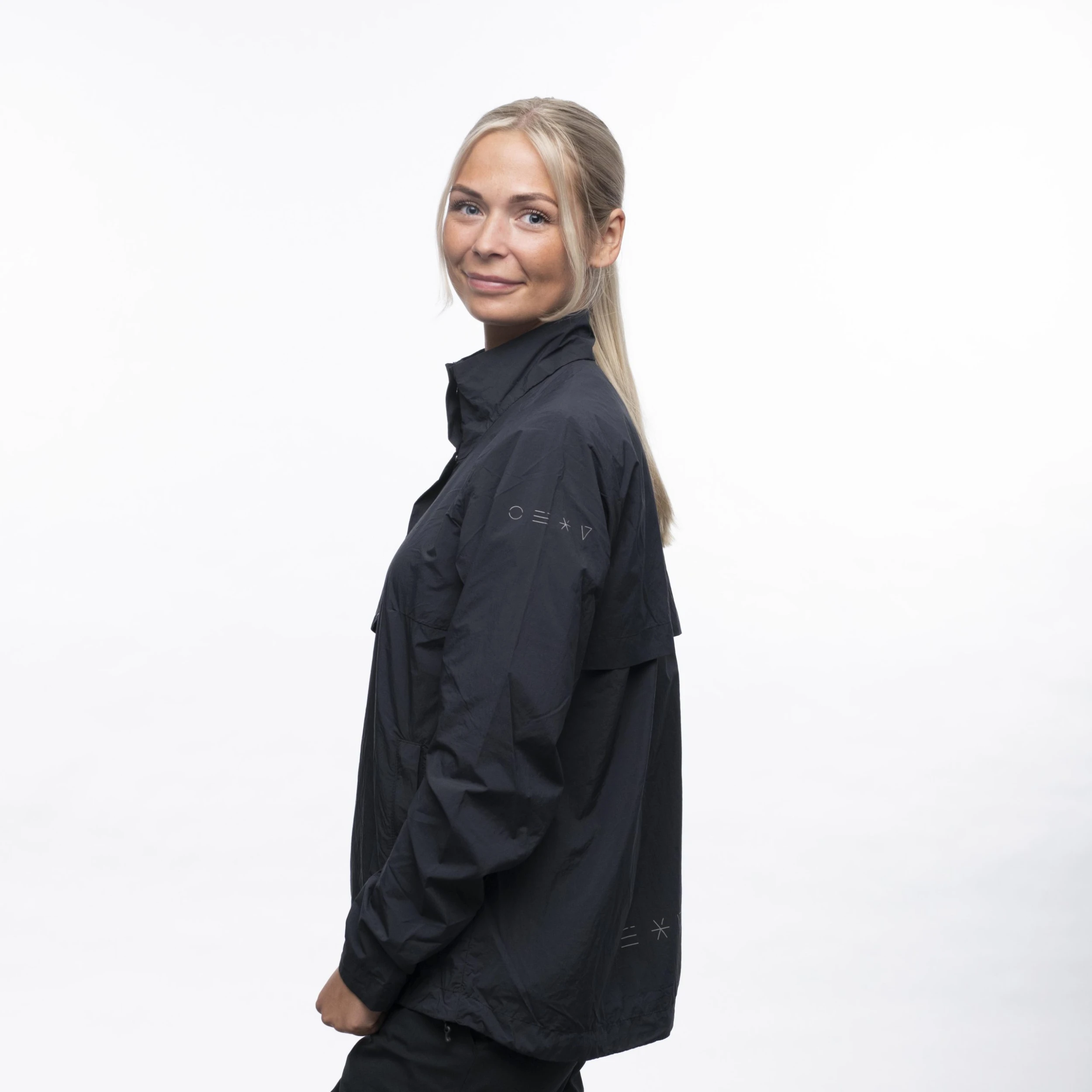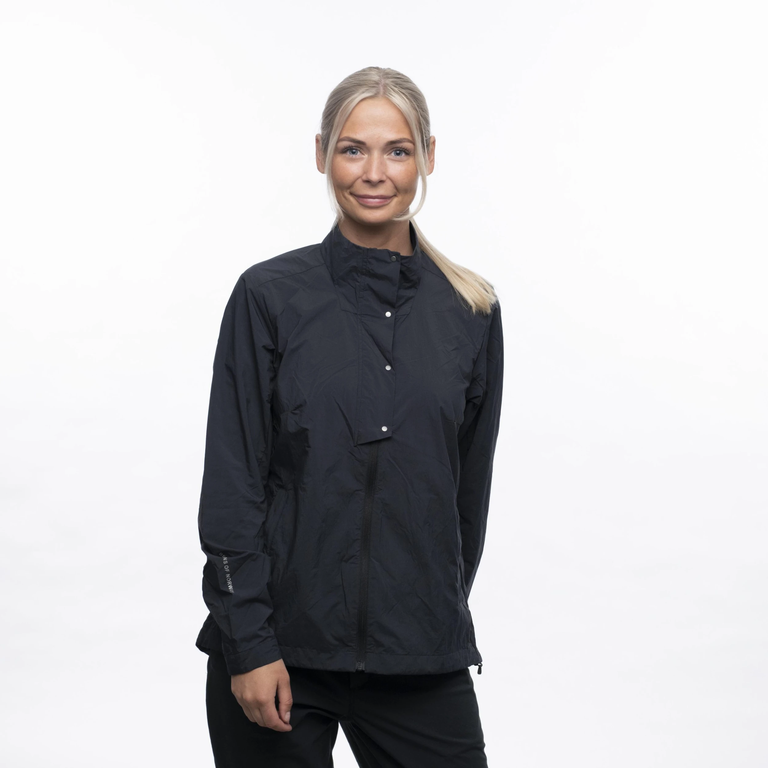 Høy krage med magnetlukking. Trykknapp nederst på ermene. Formsydd albueparti for optimal bevegelsesfrihet. Refleksdetaljer hele veien rundt gjør deg synlig fra alle kanter i trafikken. Ingen skulder- eller sidesømmer for å forhindre friksjon og gnaging. Ermene kan rulles opp og festes med trykknapper. Justerbar nederkant med snøring. Forlenget ryggparti.
