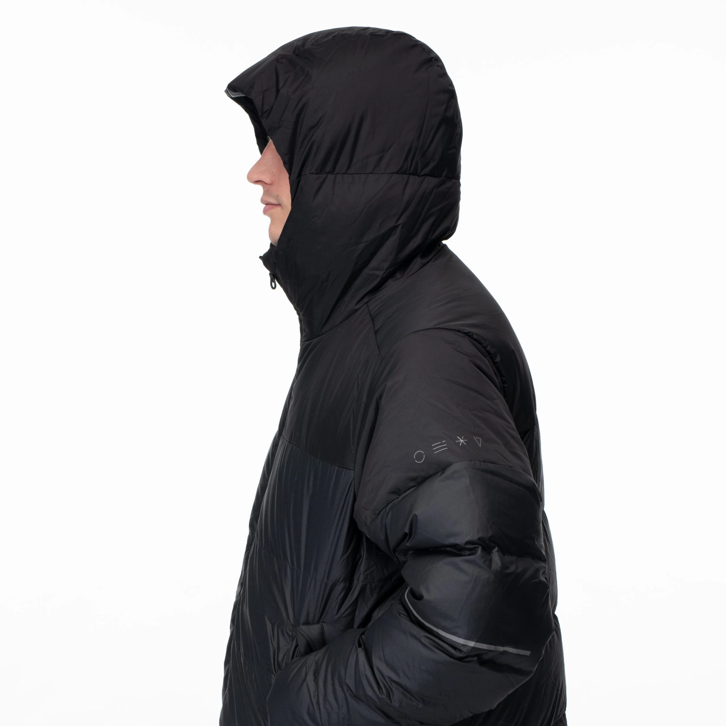Vindtett og vannavvisende Pertex® Quantum Eco-materiale (50 % resirkulert) i front, midtparti bak og på ermer. Bergans Element Active®-materiale på hetten, skuldrene, nedre del bak og øvre rygg+bryst. Hele plagget er vattert med 100 % resirkulert dun, og skulderpartiet er ytterligere vattert med PrimaLoft® Gold Insulation med Cross Core over dunkanalene. Produktet inneholder bluesign® APPROVED materialer og detaljer.