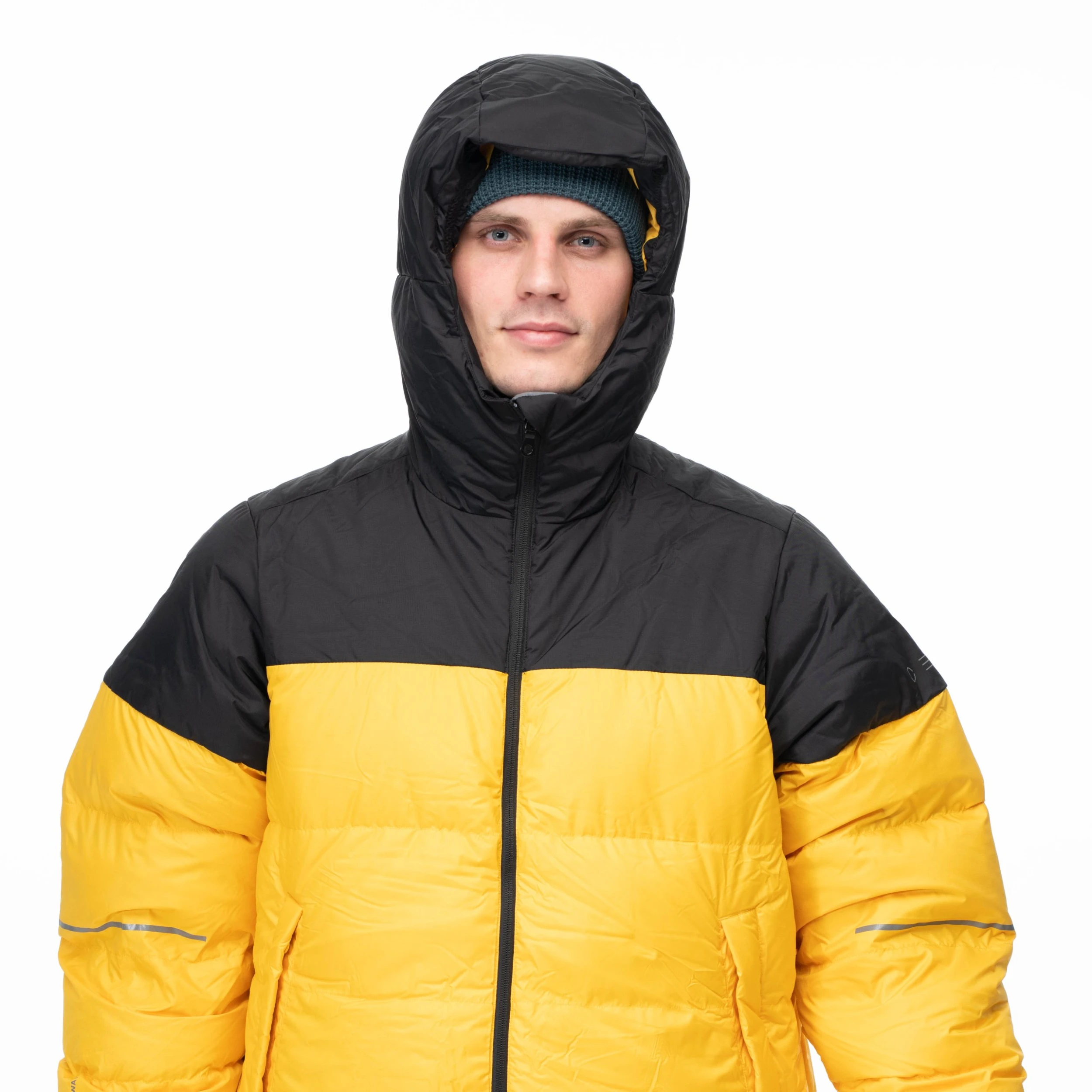 Vindtett og vannavvisende Pertex® Quantum Eco-materiale (50 % resirkulert) i front, midtparti bak og på ermer. Bergans Element Active®-materiale på hetten, skuldrene, nedre del bak og øvre rygg+bryst. Hele plagget er vattert med 100 % resirkulert dun, og skulderpartiet er ytterligere vattert med PrimaLoft® Gold Insulation med Cross Core over dunkanalene. Produktet inneholder bluesign® APPROVED materialer og detaljer.