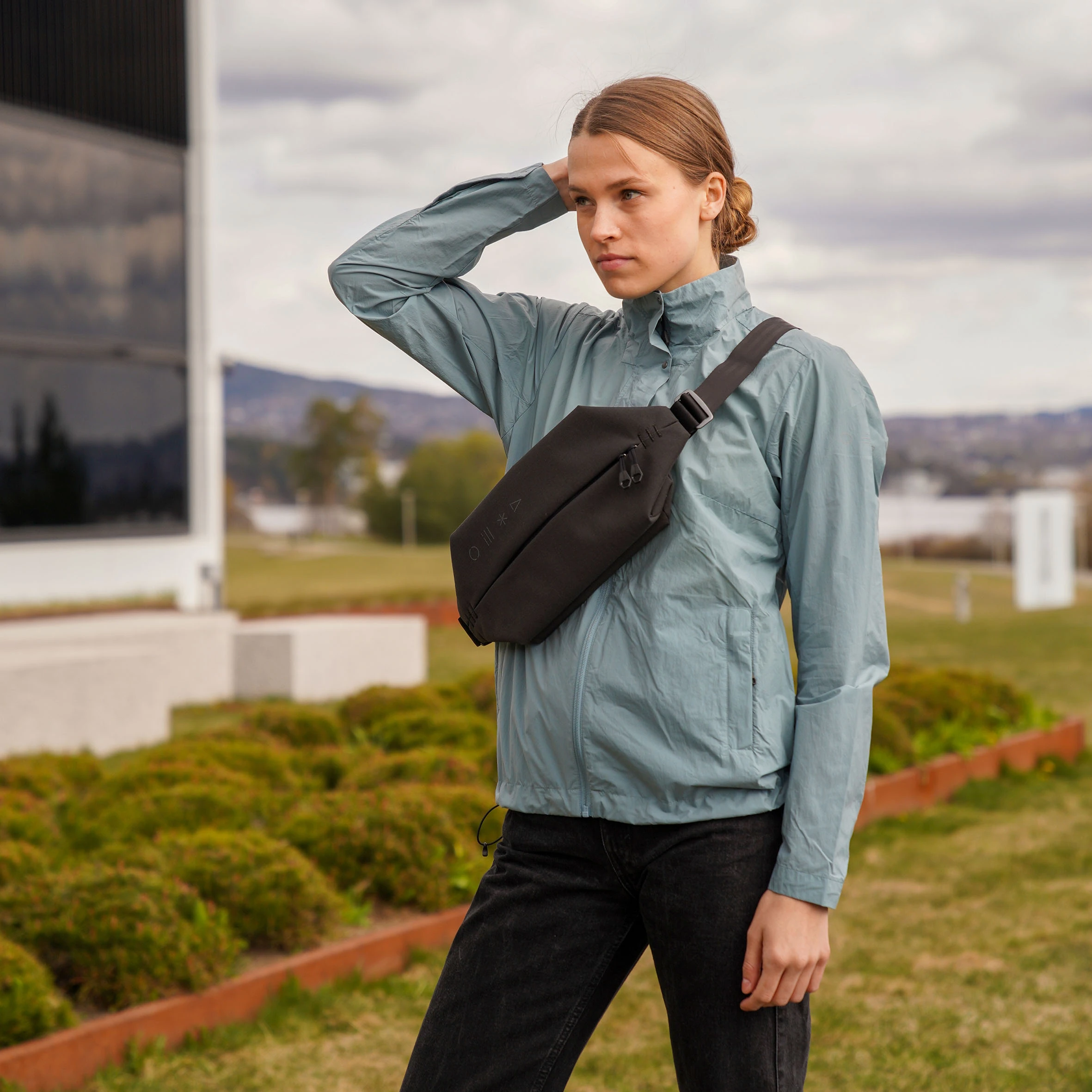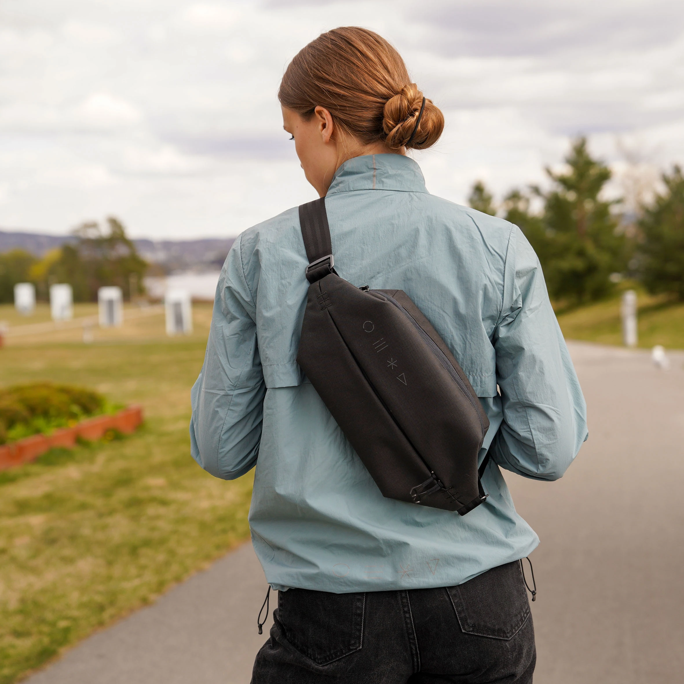 Oslo Urban Sling er helt perfekt for de dagene du trenger å ha med deg mer enn bare mobilen og nøklene. Hovedrommet åpnes ovenfra og er stort nok til ekstrajakken eller vannflasken du trenger når du er på farten. Siden skuldervesken bæres tvers over og tett inntil kroppen, kjenner du knapt at du bærer ekstra vekt. Vesken kan komprimeres i sidene, slik at størrelsen kan tilpasses etter innholdet. Et resirkulert materiale fremstilt av PET-flasker og resirkulert nylon var et naturlig valg for å redusere produktets klimaavtrykk.