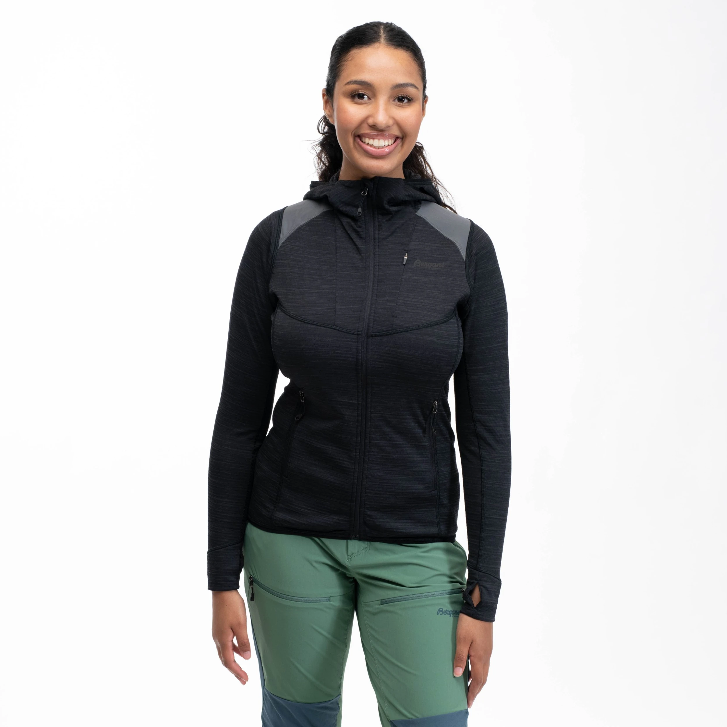 Rabot Active Mid Hood W Jacket er en utrolig lett og svært teknisk mellomlagsjakke med en kroppsnær passform. Som aktive friluftsentusiaster vet vi hvor viktig det er at alle kleslagene kan transportere bort fuktighet. Hvis ikke mellomlaget gjør jobben sin, får ikke inner- og ytterlagene sjansen til å prestere heller. Rabot Active Mid Hood Jacket er designet for å effektivt lede bort fuktighet fra innsiden til utsiden og sørge for komfort gjennom hele dagen. Det lette og tekniske materialet, hvorav 42 % består av resirkulerte fibre, er dessuten utrolig komprimerbart, slik at jakken tar minst mulig plass i sekken når du ikke har den på. Den er polstret på skuldrene, noe som gjør det mer komfortabelt å bære ryggsekk.