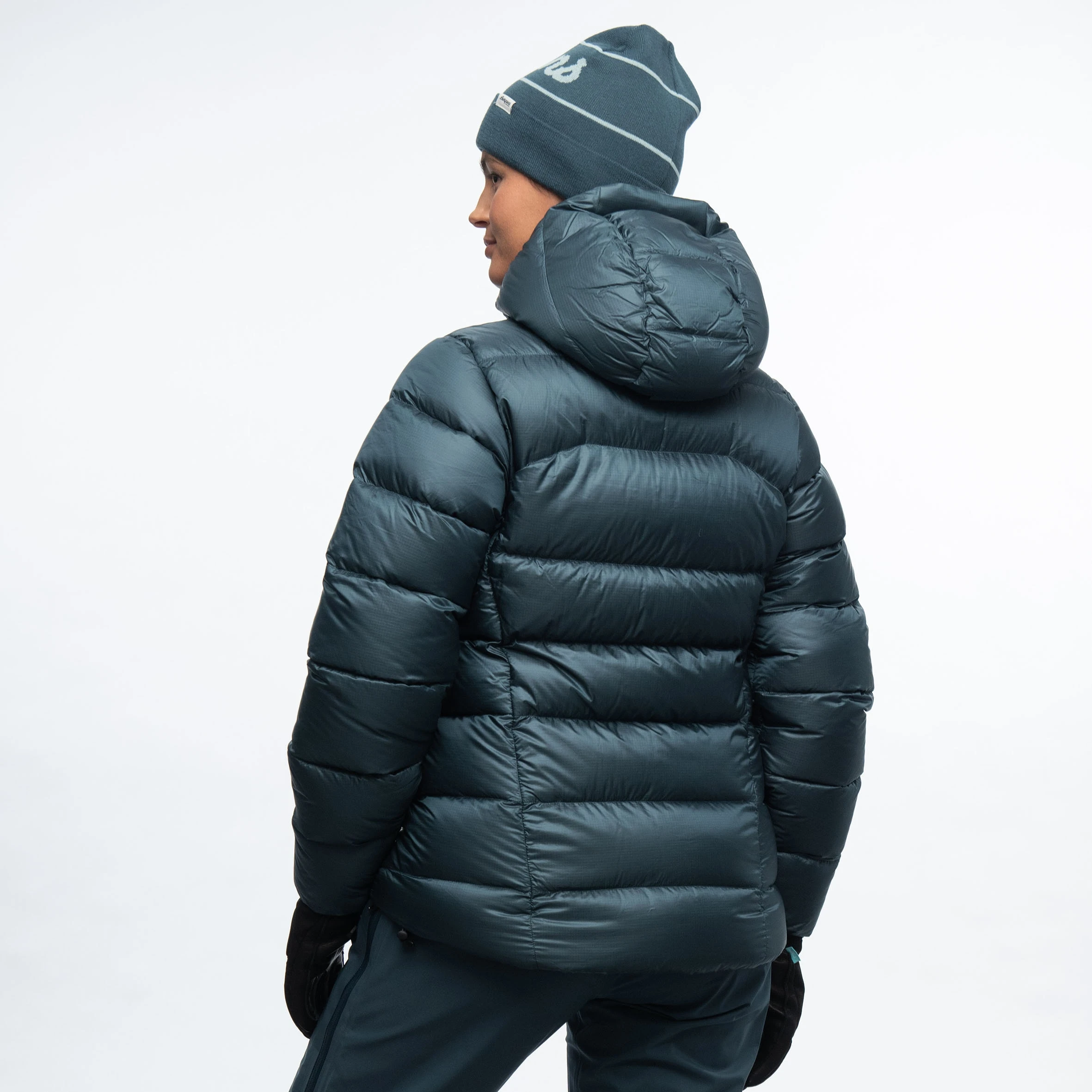 Ekstra varme når det er ekstra kaldt. Senja Down W Jacket er designet for å gi maksimal varme og samtidig holde lavest mulig vekt og pakkvolum. Panelene er fylt med sertifisert ansvarlig dun i en bokskonstruksjon som sikrer at dunenes isolasjonspotensial blir utnyttet til fulle og hindrer dannelse av kuldebroer. Pertex Quantum®-materialet er vindtett og vannavvisende. Høy, beskyttende krage og hjelmtilpasset hette gir perfekt beskyttelse av hals og hode. Skulder- og sidesømmene er forskjøvet for å hindre slitasje og øke komforten ved bæring av sekk. Pakk Senja Down W Jacket i sekken før toppturen og slipp å bekymre deg for at du vil fryse.