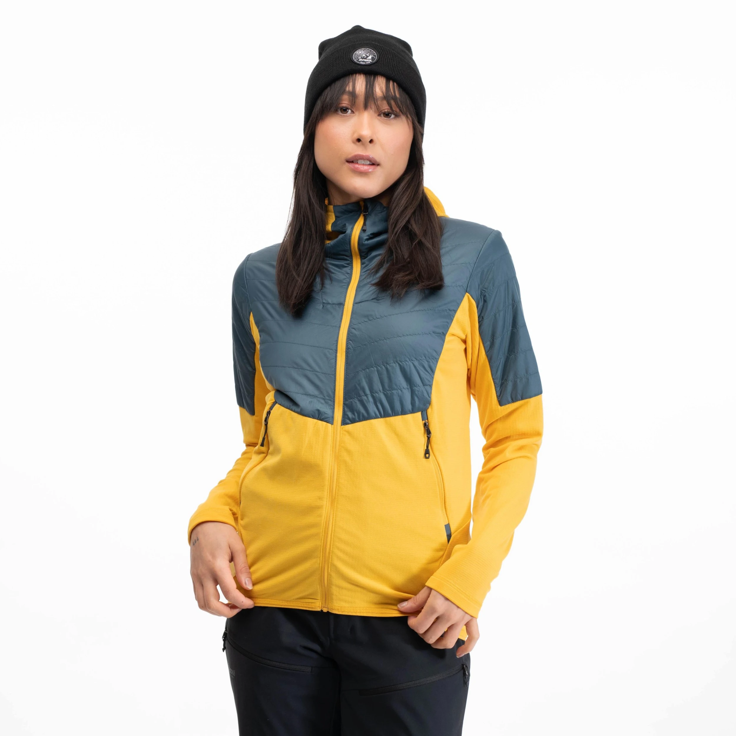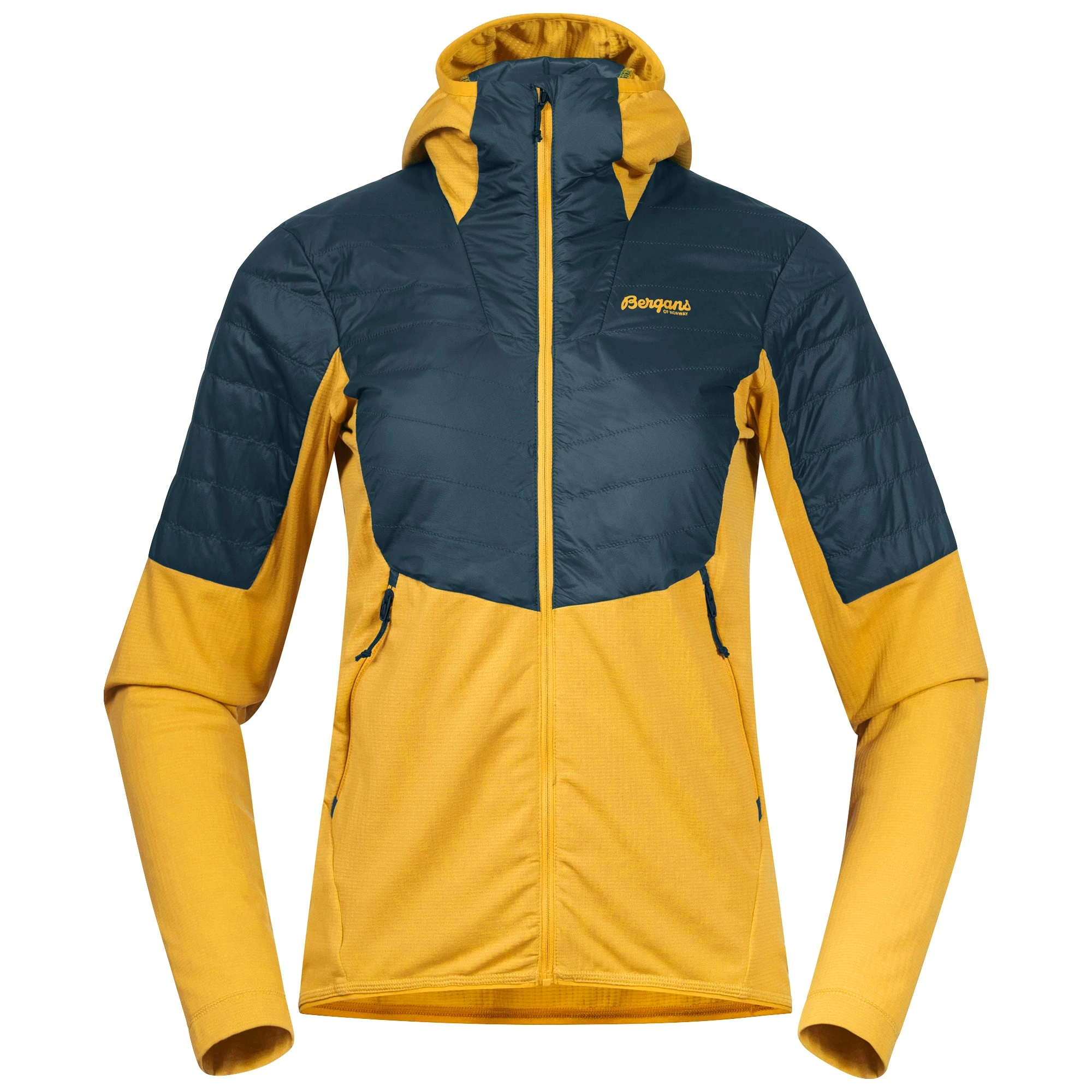 Ta på et varmende mellomlag. Med sin kombinasjon av to svært tekniske materialer vil Senja Midlayer Hood W Jacket raskt bli et av dine favorittmellomplagg når du skal på topptur. Jakken er laget i et ultralett, vind- og vanntett polyamidmateriale vattert med isolerende Clo® Eco Vivo på utsatte områder som skuldre og ermekanter. Nedre del av bolet er dekket med Pontetorto Tecnostretch®, som har utmerkede fukttransporterende og hurtigtørkende egenskaper. Skulder- og sidesømmene er forskjøvet for å hindre slitasje og øke komforten ved bæring av sekk. Senja Midlayer Hood W Jacket har også en tettsittende hette og beskyttende, høy krage samt frontlommer med glidelås.