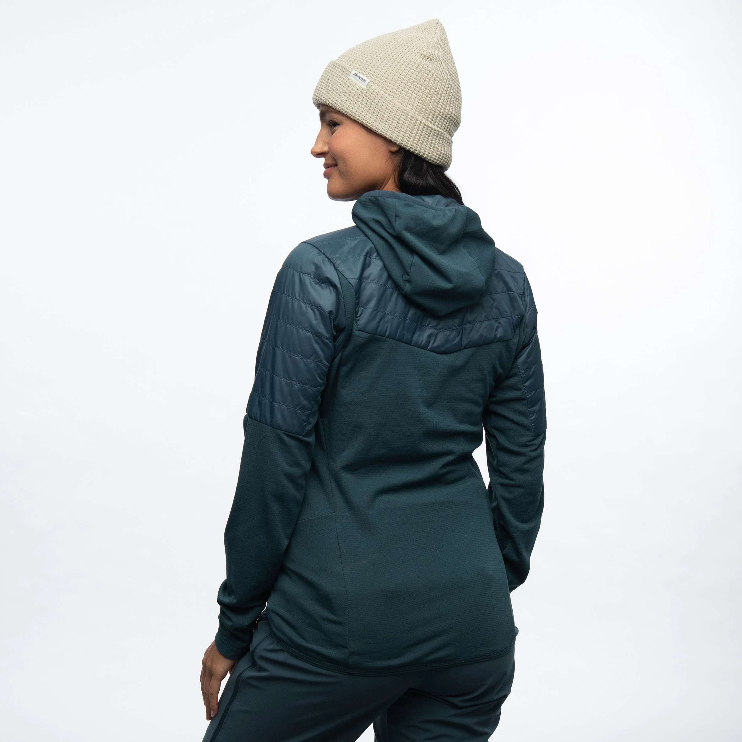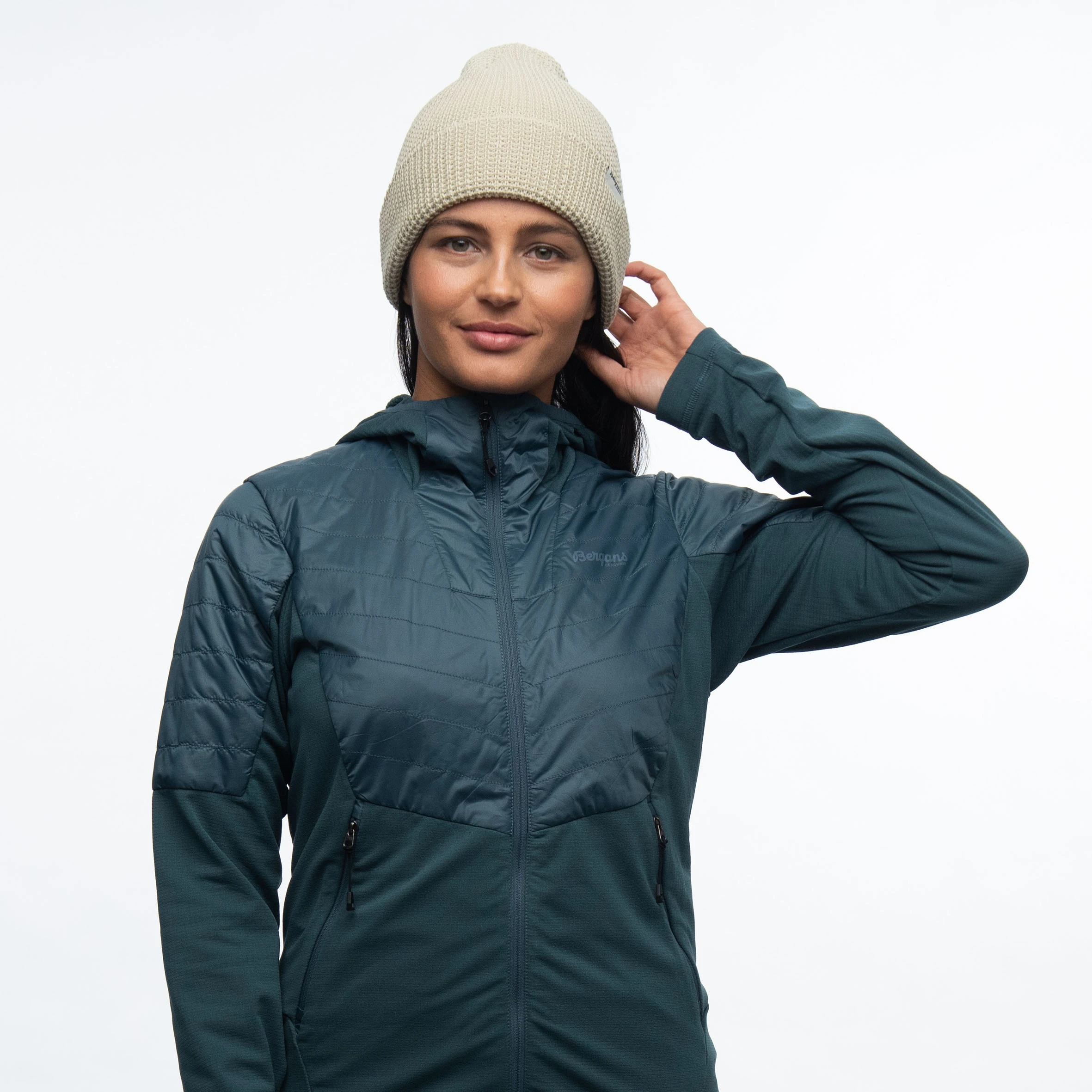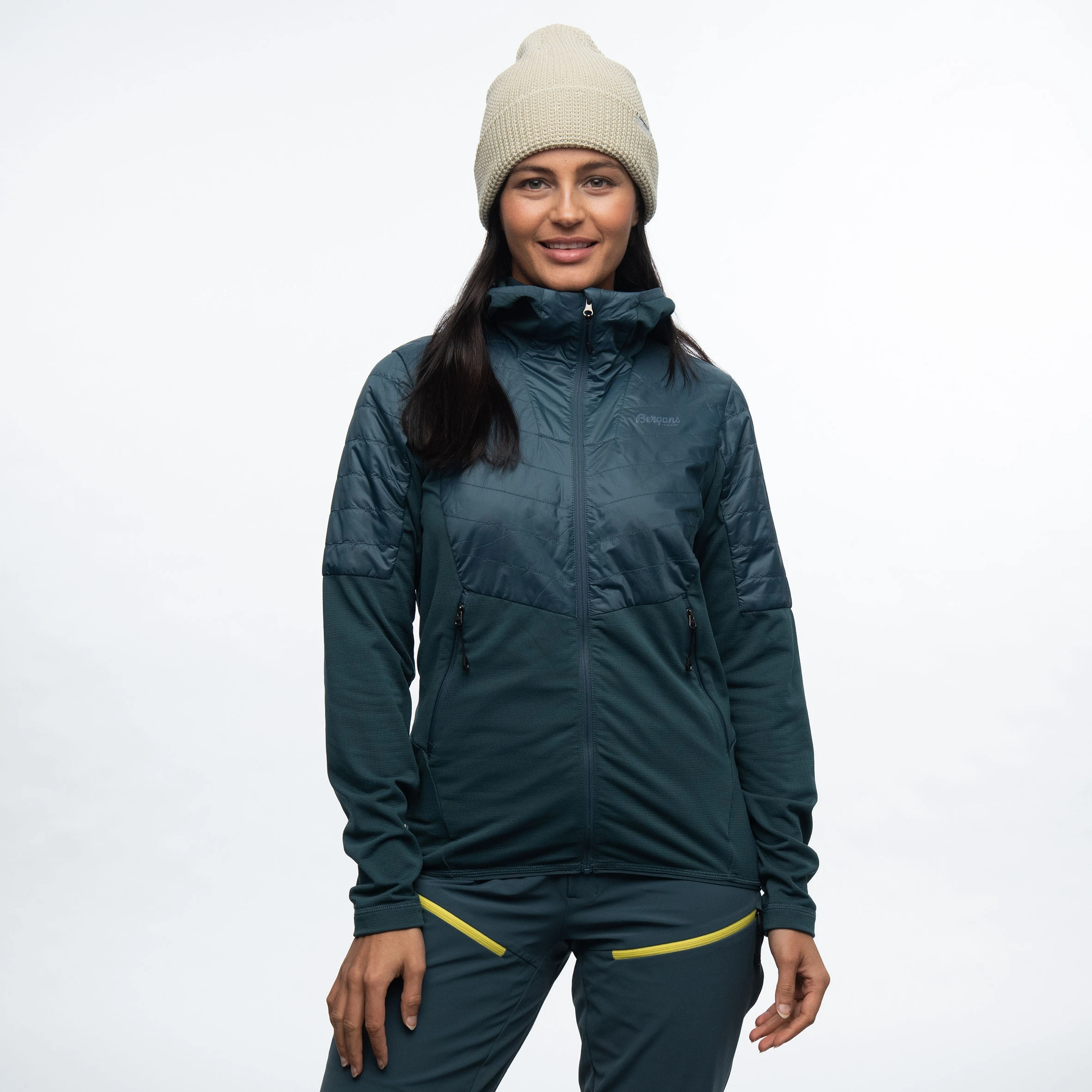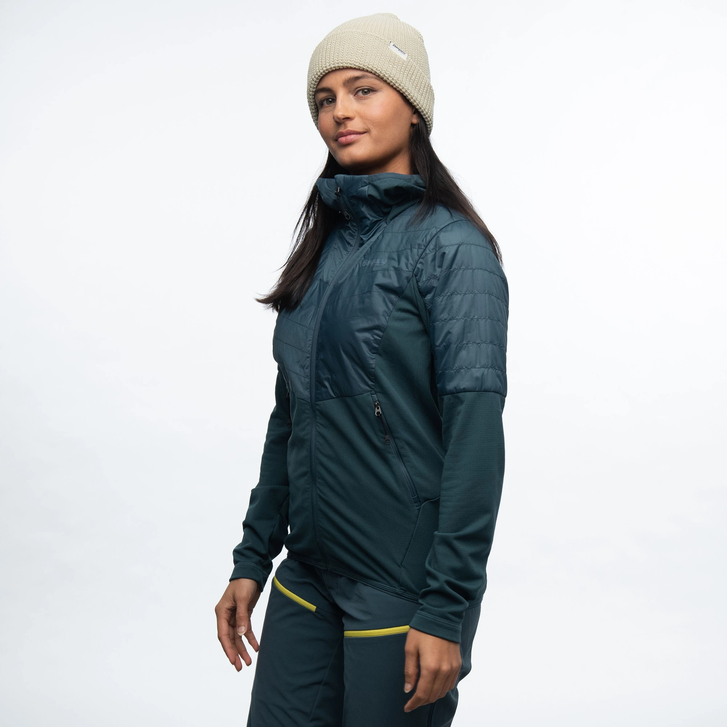 Ta på et varmende mellomlag. Med sin kombinasjon av to svært tekniske materialer vil Senja Midlayer Hood W Jacket raskt bli et av dine favorittmellomplagg når du skal på topptur. Jakken er laget i et ultralett, vind- og vanntett polyamidmateriale vattert med isolerende Clo® Eco Vivo på utsatte områder som skuldre og ermekanter. Nedre del av bolet er dekket med Pontetorto Tecnostretch®, som har utmerkede fukttransporterende og hurtigtørkende egenskaper. Skulder- og sidesømmene er forskjøvet for å hindre slitasje og øke komforten ved bæring av sekk. Senja Midlayer Hood W Jacket har også en tettsittende hette og beskyttende, høy krage samt frontlommer med glidelås.