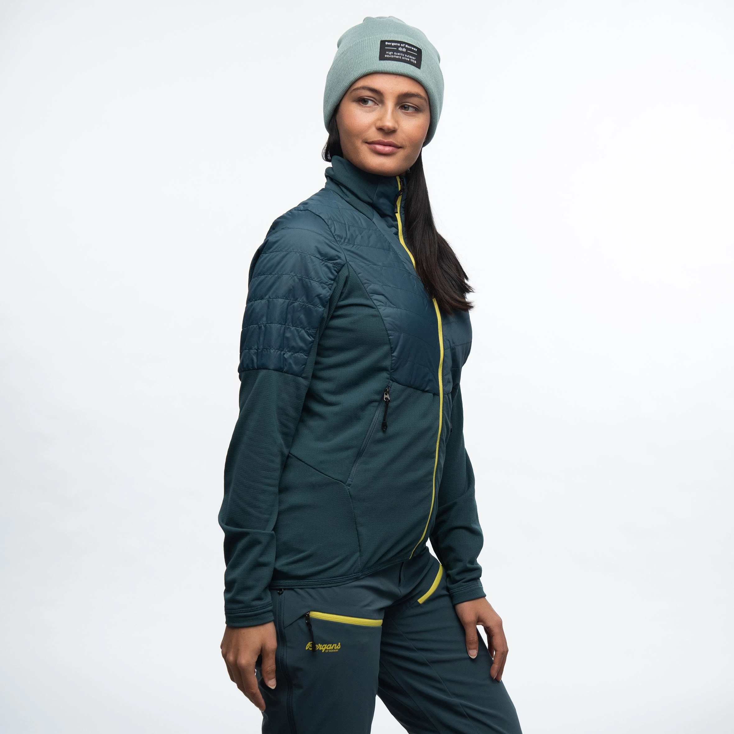 Ta på et varmende mellomlag! Med sin kombinasjon av to svært tekniske materialer vil Senja Midlayer W Jacket fort bli ditt nye favoritt-mellomplagg på topptur. Jakken er laget i et ultralett, vind- og vanntett polyamidmateriale vattert med isolerende Clo® Eco Vivo på utsatte områder som skuldre og overarmer. Nedre del av bolet er dekket med Pontetorto Tecnostretch®, som har utmerkede fukttransporterende og hurtigtørkende egenskaper. Skulder- og sidesømmene er forskjøvet for å hindre slitasje og øke komforten ved bæring av sekk. Senja Midlayer W Jacket har også en beskyttende, høy krage og frontlommer med glidelås.