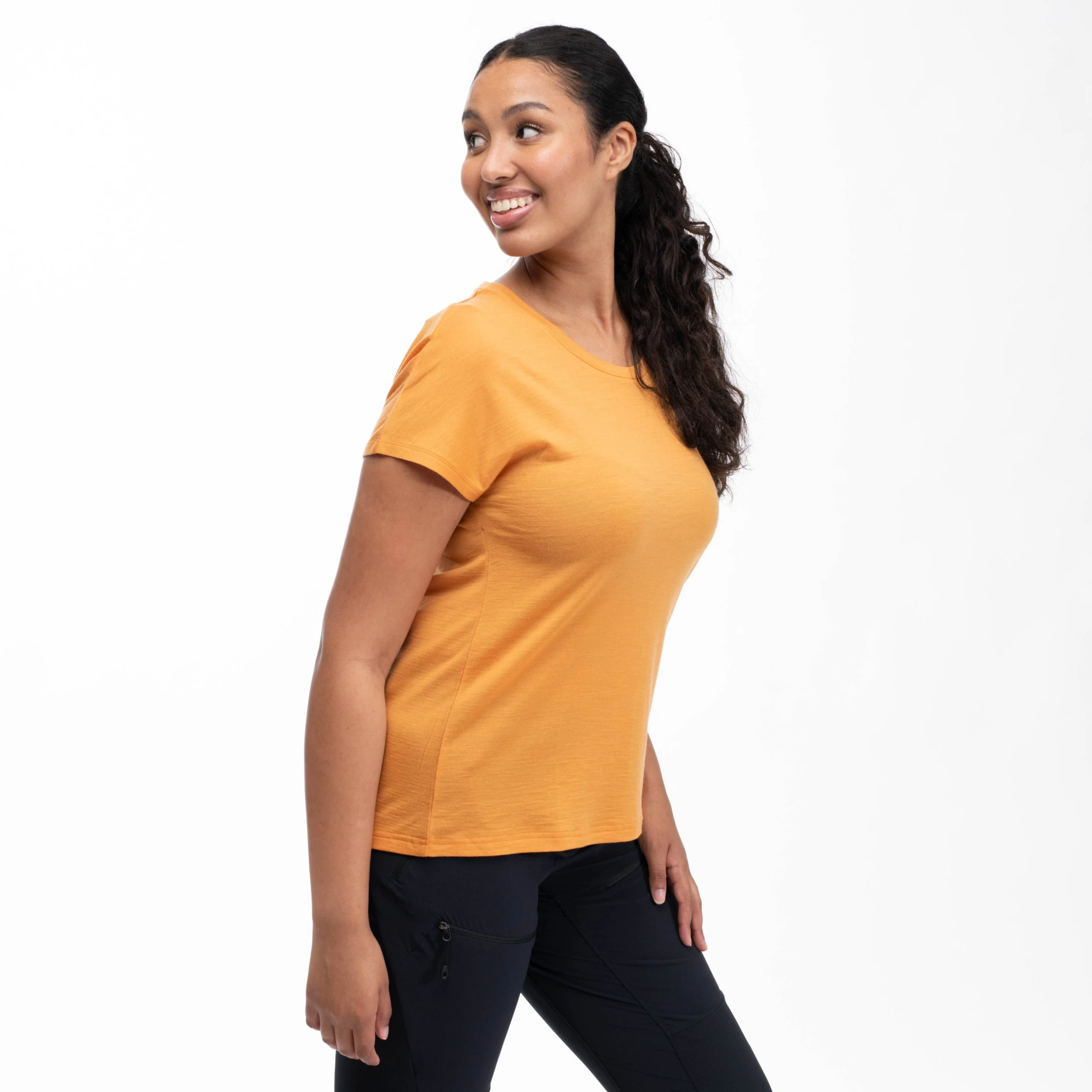 Urban Wool W Tee er fremstilt av en blanding av merinoull og Tencel som føles svalende mot huden på varme dager og varmer på kalde dager. Merinoullen varmer selv om den blir våt og kan ta opp mer enn 30 % av sin egen vekt før den føles fuktig.