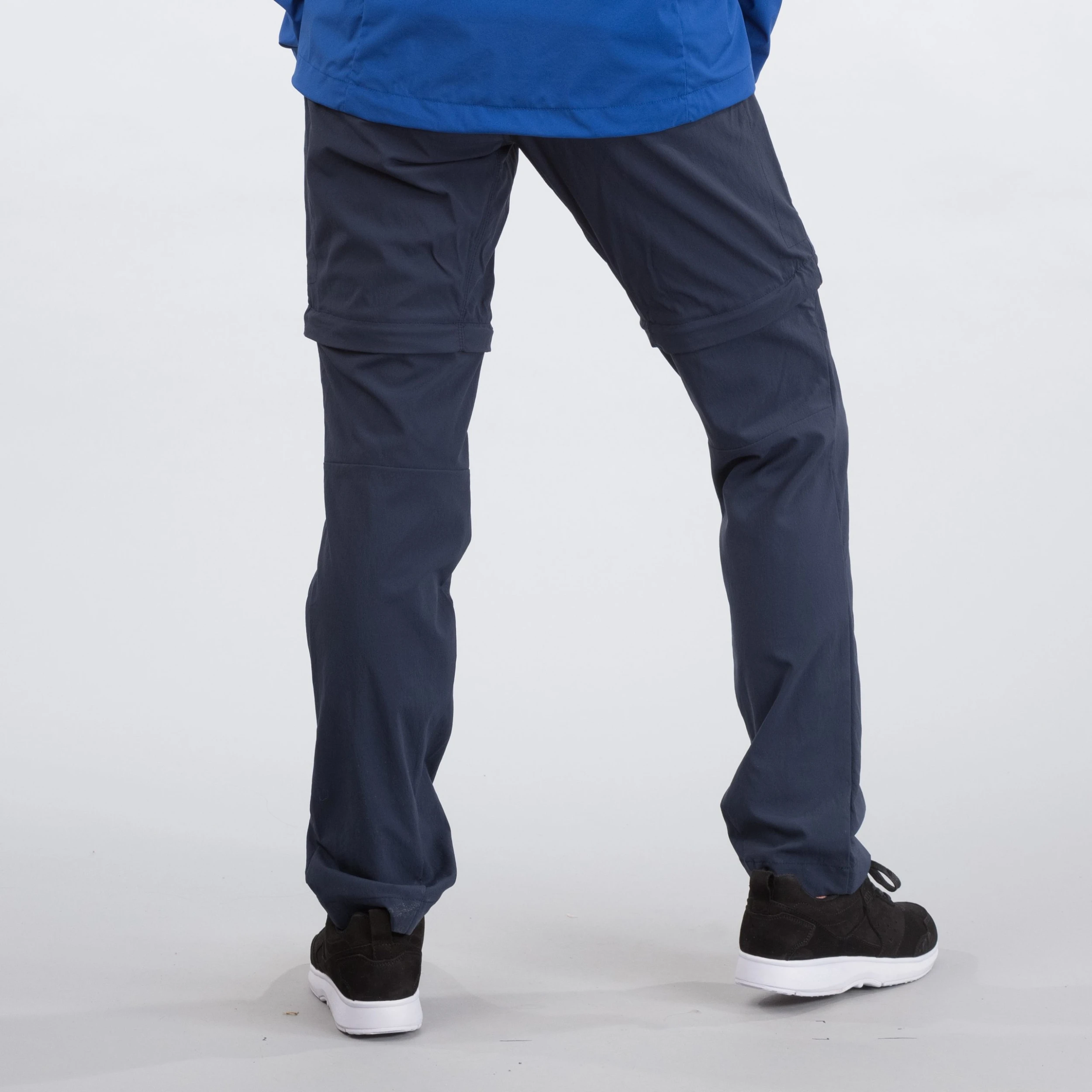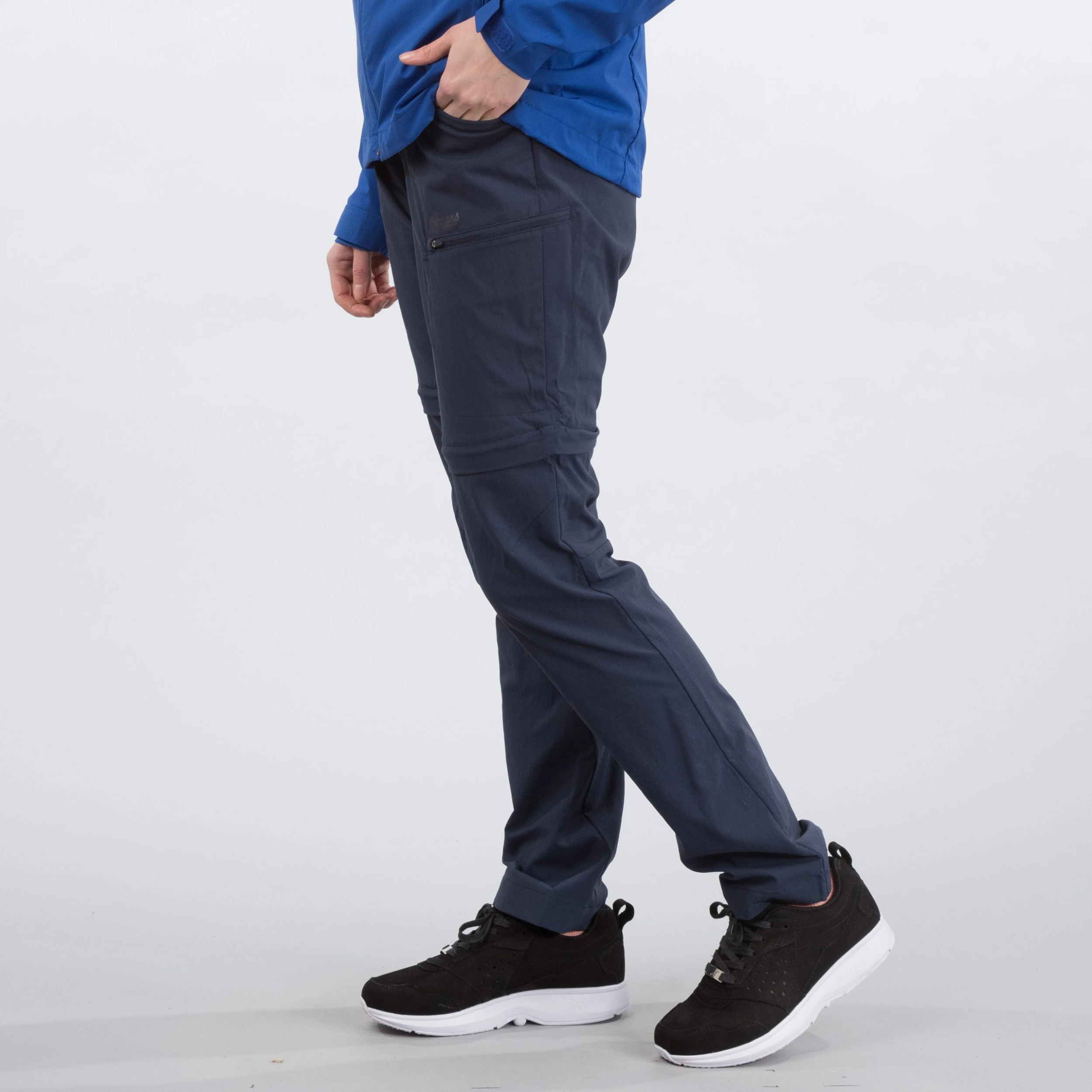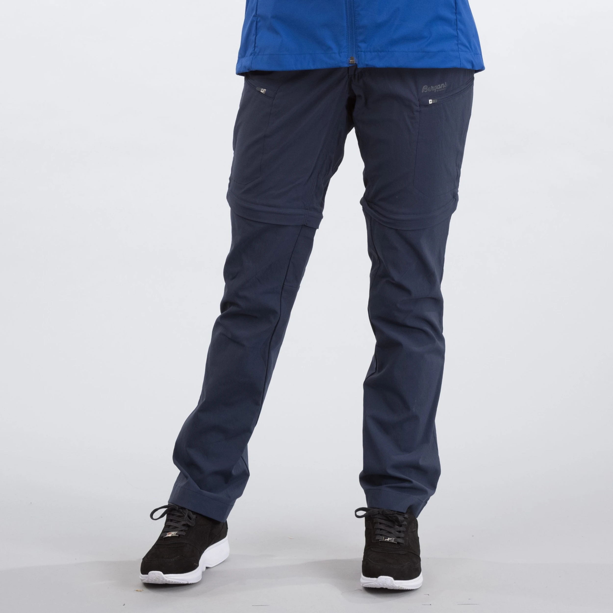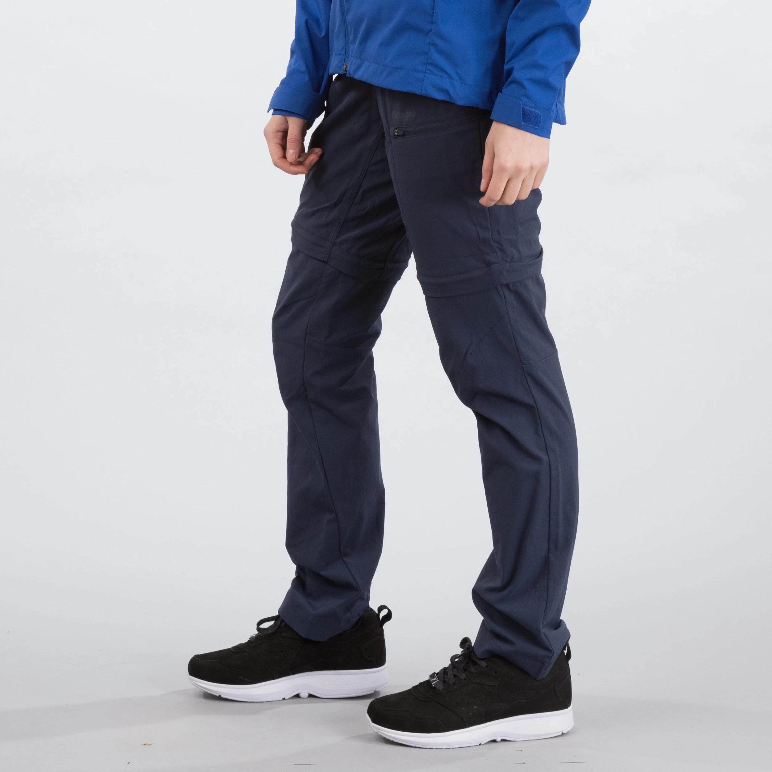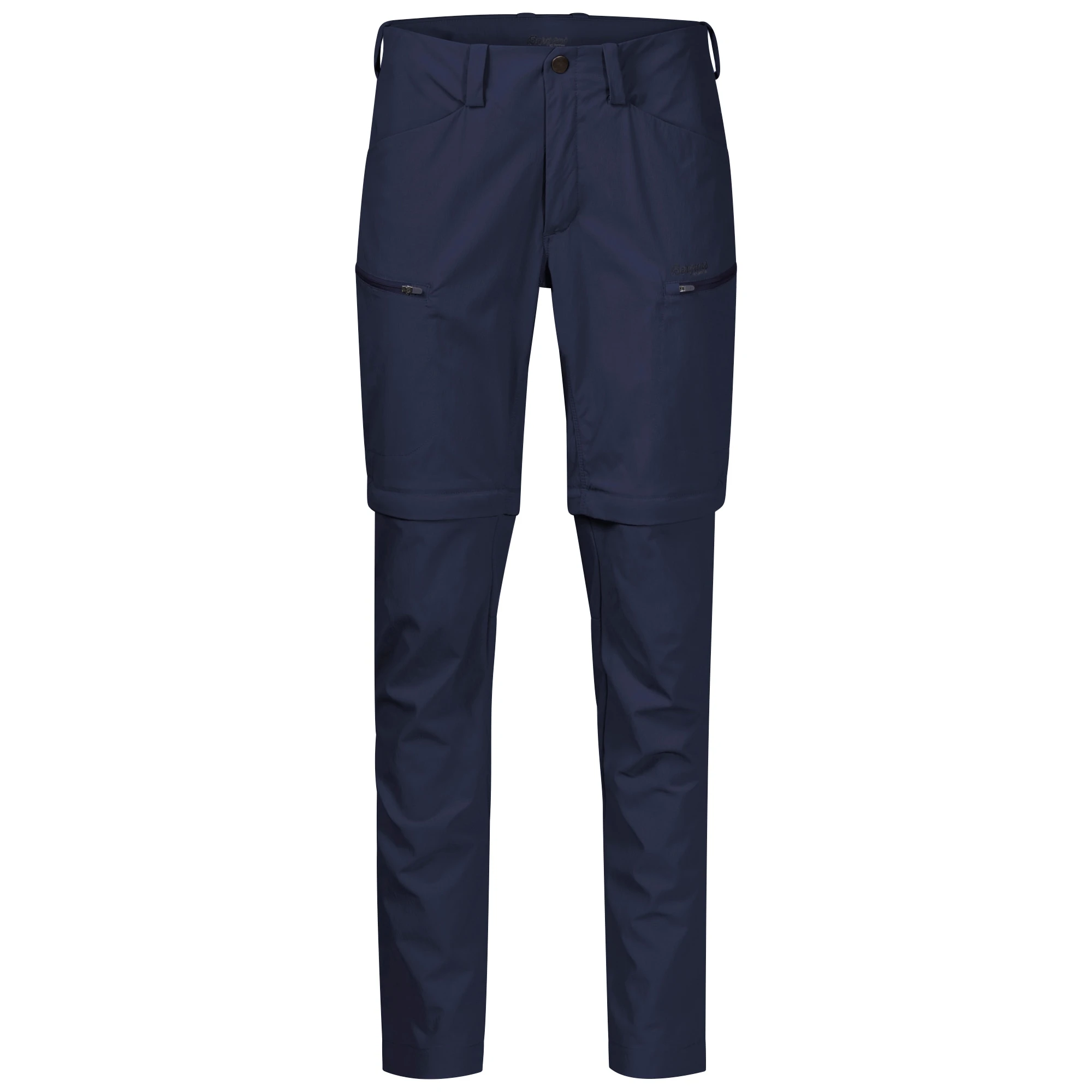 Beltehemper. Formsydd kneparti. Avtakbare ben for omgjøring til shorts. Panelkonstruksjon i skrittet for å forhindre friksjon og gnaging på innsiden av lårene.
