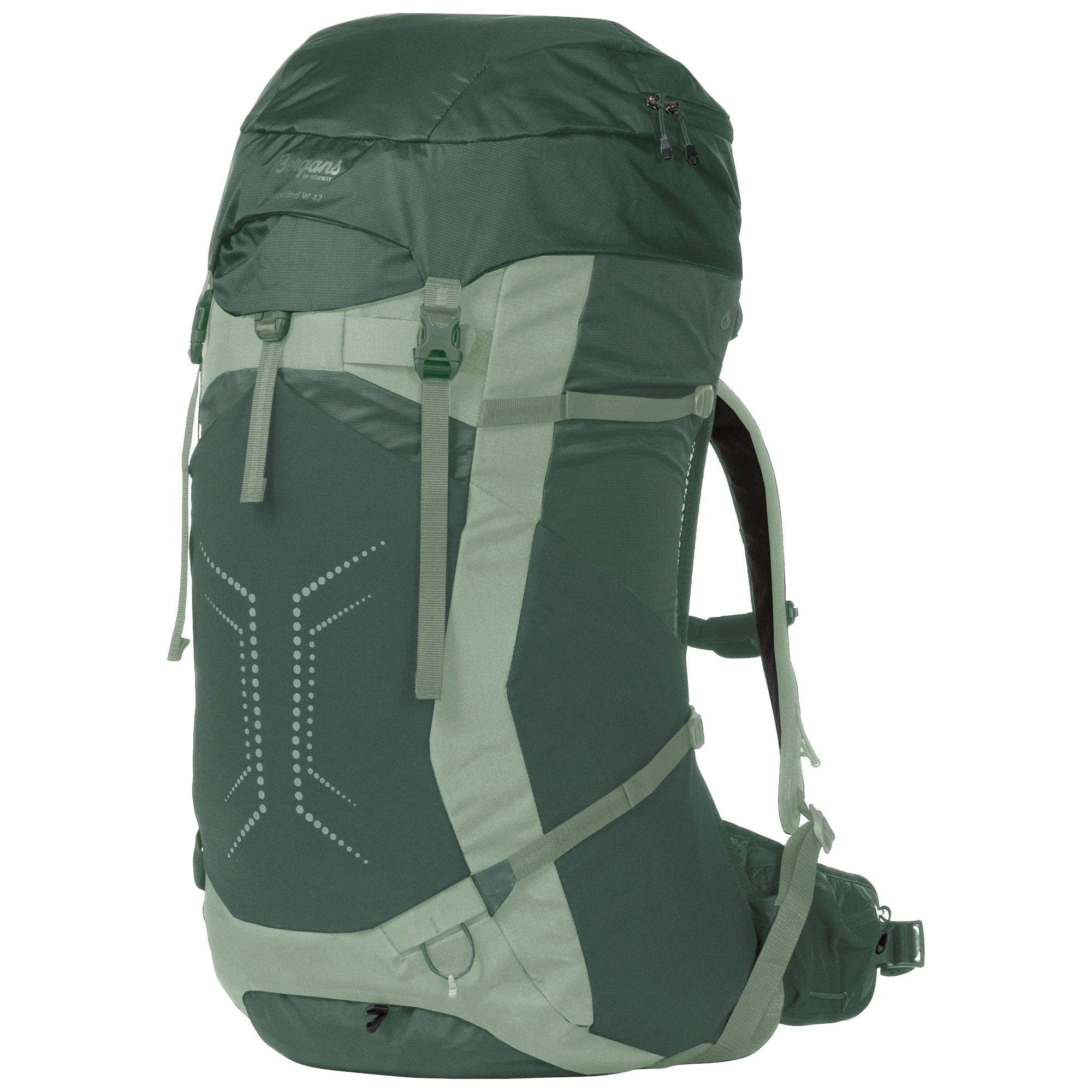 Serien Vengetind består av teknisk avanserte, lette ryggsekker med et unikt bæresystem. Vengetind W 42 er tilpasset kvinners anatomi. Et perfekt valg hvis du vil ha en robust og allsidig ryggsekk med høy ytelse og justerbar rygglengde. Ryggsekken er utstyrt med VentiLightTM, vår nyeste teknologi innen lette og funksjonelle bæresystemer. Rygg i oppspent mesh (netting), skulderremmer og hoftebelte gir optimal ventilasjon og gjør Vengetind W 42 til en fryd å bære, også på krevende turer. Ryggsekken er klargjort for drikkesystem og har festepunkter for utstyr som isøks og vandrestaver.